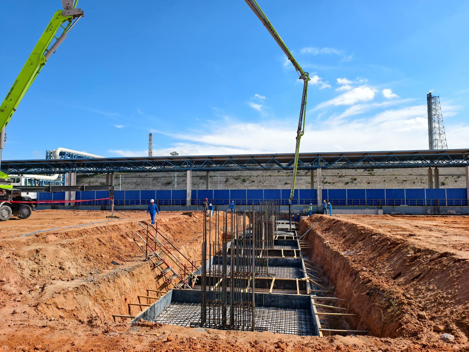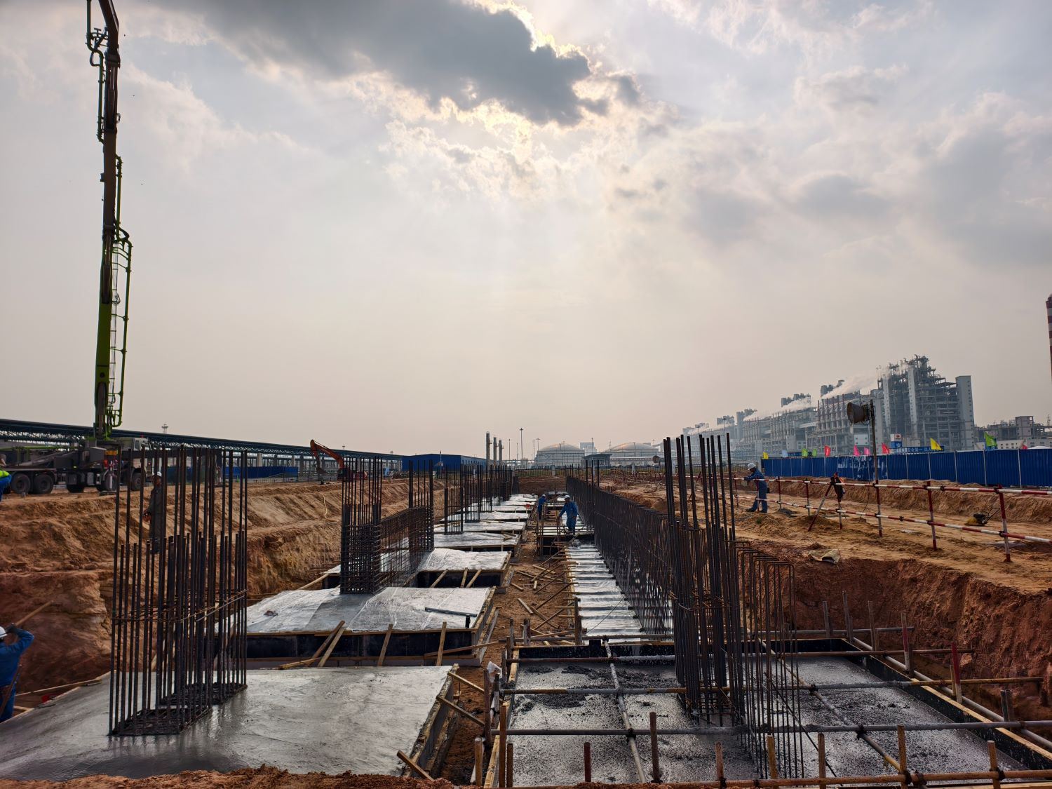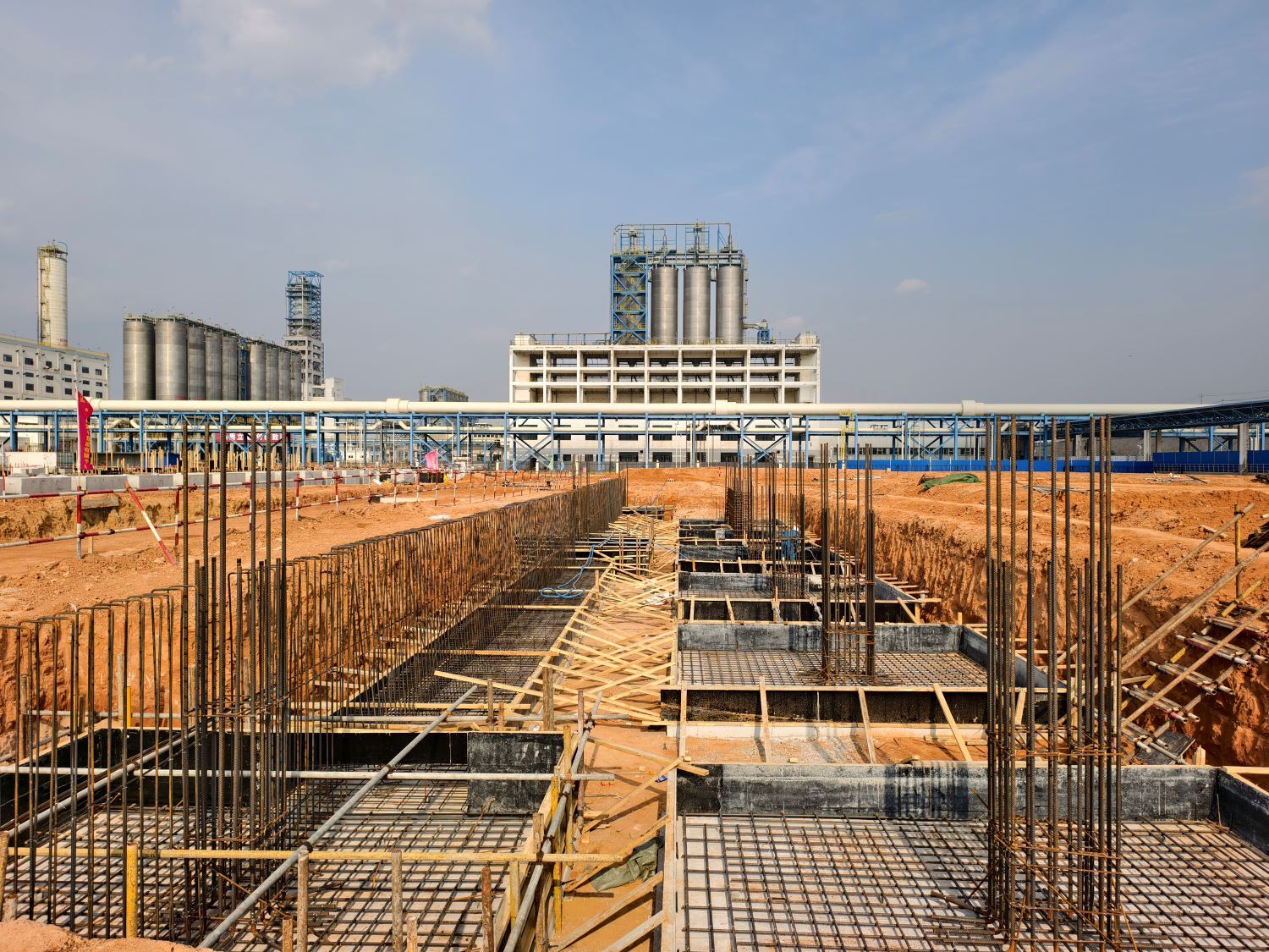 作为保障EVA装置产品存储、运输的“核心枢纽”,成品仓库基础工程的进度直接牵动整个装置的建设周期,其重要性不言而喻。自工程开工以来,项目部便面临多重挑战:一方面需响应业主“施工即有管理人员在岗监管”的严格要求,另一方面又遭遇中秋、国庆双节施工统筹压力,叠加十月多雨天气对户外作业的不利影响。面对困境,项目部主动破局,以科学策划为先导,通过优化施工方案、精准调配人力与物资资源、强化安全质量全流程管控等系列举措,实现了基础施工各道工序的高效衔接与稳步推进。